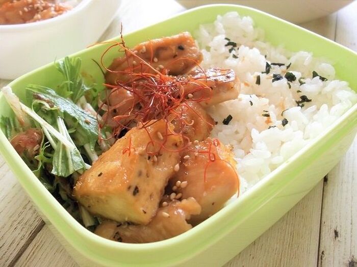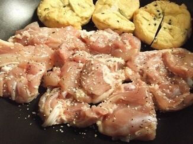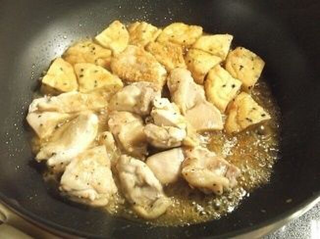 4等分したがんもどきも並べ、鶏肉の上から軽く塩コショウ。
