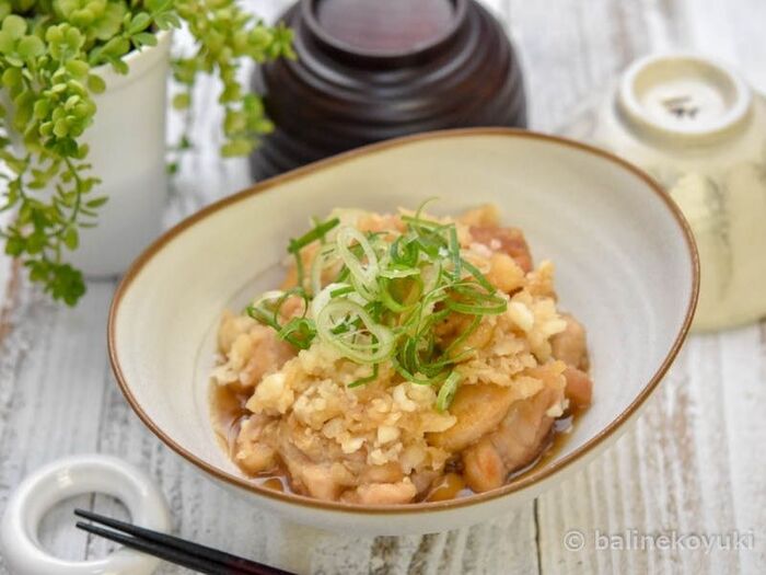 ●普通の大根おろし器でおろした大根おろしでは水っぽくなってしまいますが、鬼おろしでおろした大根おろしはあら目なので、水っぽくならず、だしをしっかり吸い込んでくれるので、鶏肉とよく絡めていただきます。