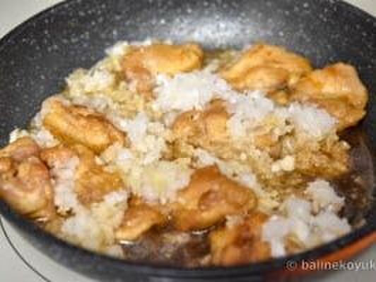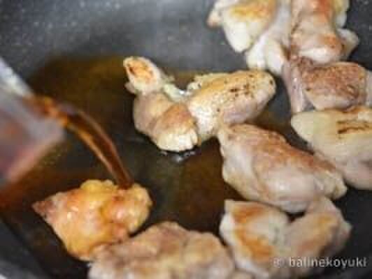 鶏肉は一口大に切る。塩コショウを振り、片栗粉をまぶす。フライパンに米油を入れて熱し、鶏肉を両面焼き色がつくくらいまで焼く。
