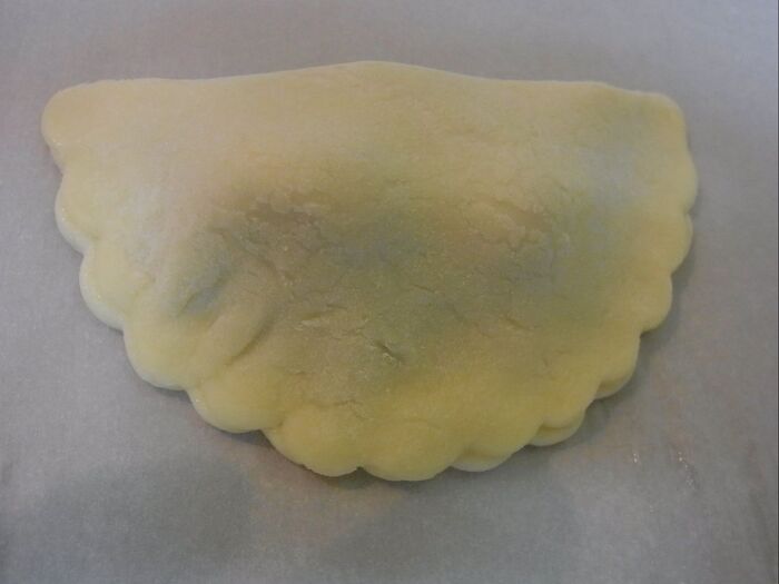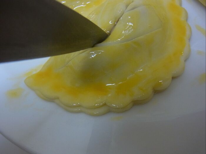 *生地の半面の端に卵液を付けて半分に折り、指で押さえて止めます。