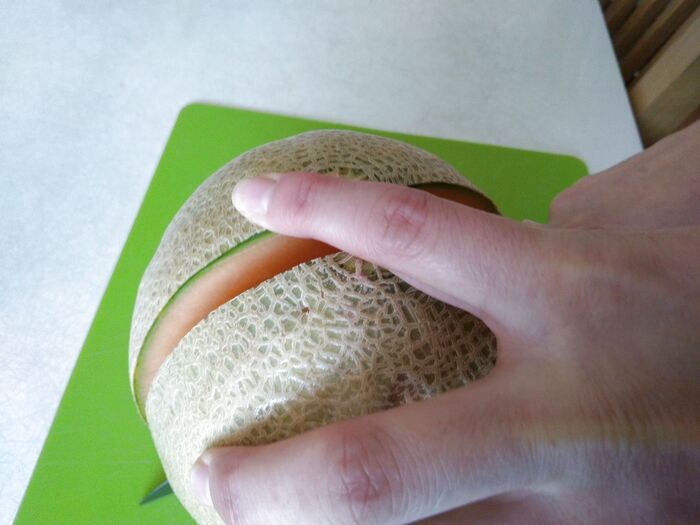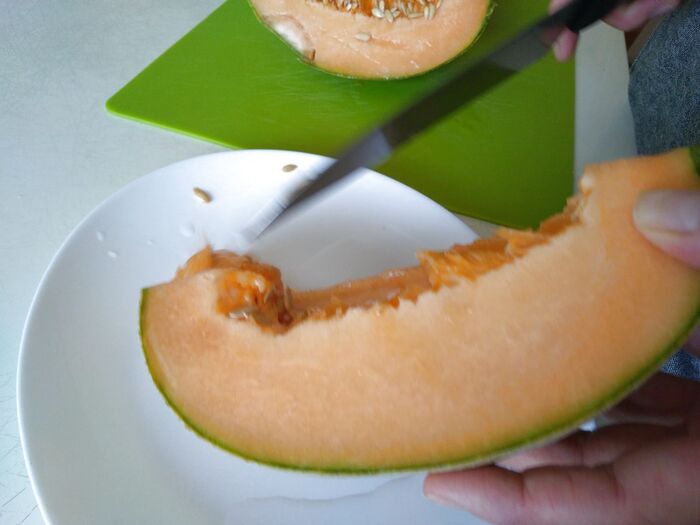 実は、カンタロープメロンは買ってからすぐに食べると硬いので、すでに1週間経過した状態からスタートしています。