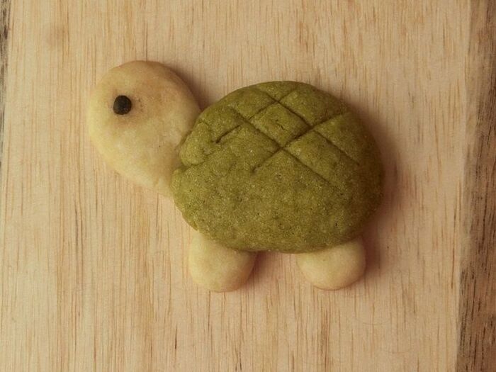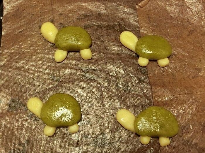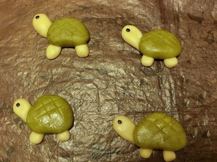 黒い生地で目をつけたら、甲羅に網目模様をつけます。