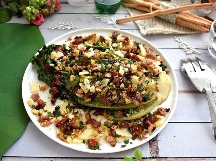 グリルしたロメインレタスを器に盛り付け ドレッシングをかけて