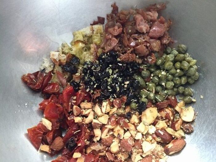 小さく切ったドライトマト 砕いたアーモンド ケーパー 松の実を
