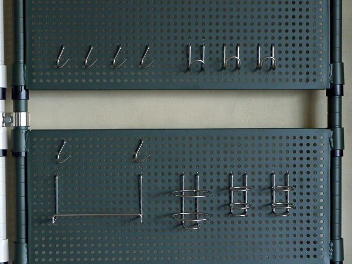 ハンギングしたいものに合わせて収納スペースをより細かく設定できるよう、有孔ボードは12.5mmピッチのものになっています。 25mmピッチ用の市販のフックを使えます。