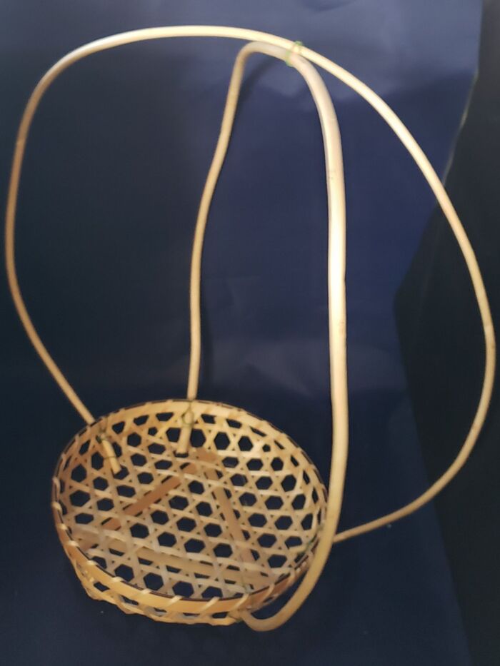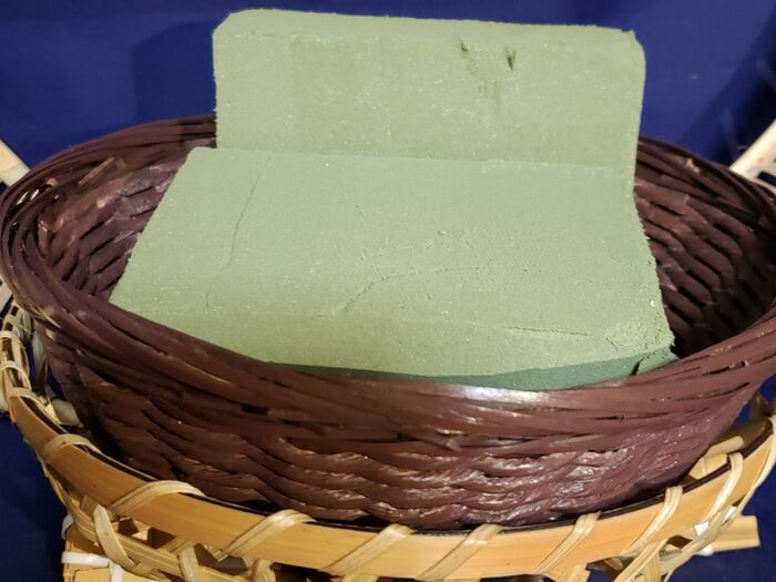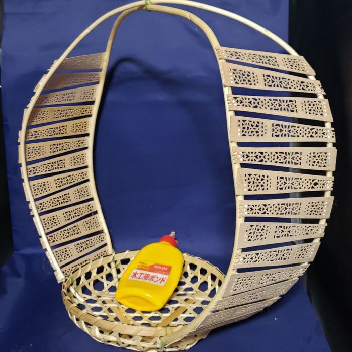 ⑩ 竹の籠の下に竹のおしぼり置を逆向きにしてアレンジワイヤー(細い針金)で固定する。