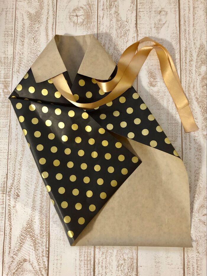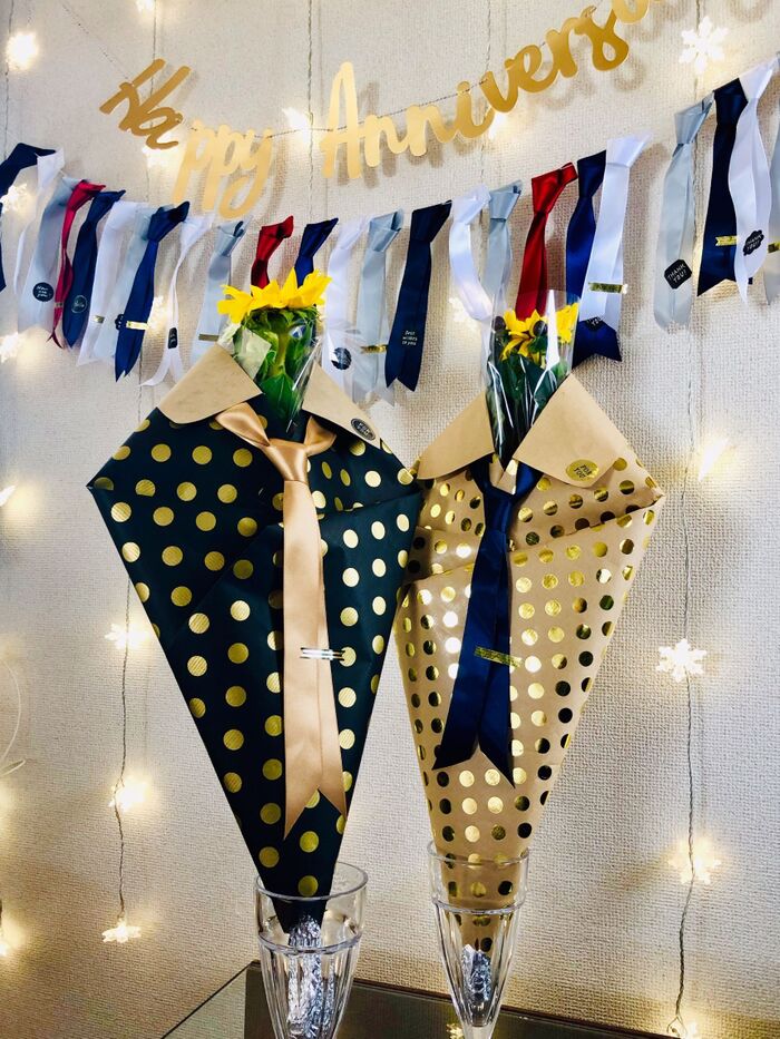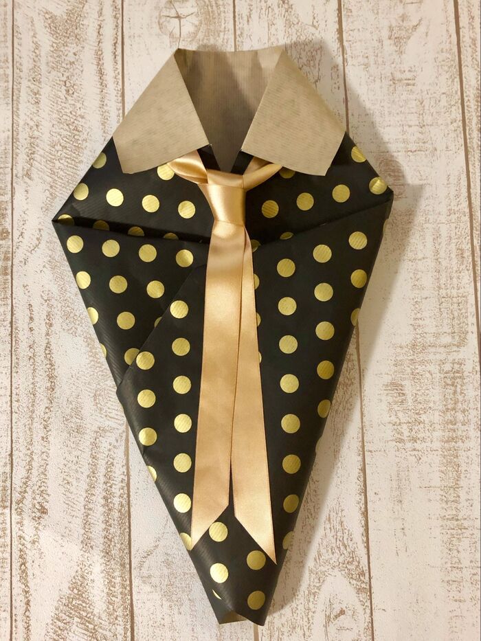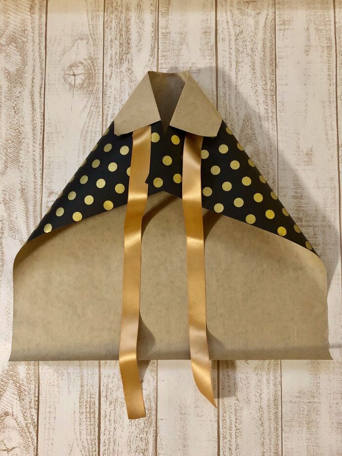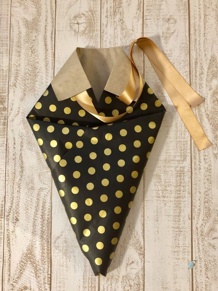 ネクタイのようにリボンをしめたらYシャツ風フラワーラッピングカバーの出来上がり^^