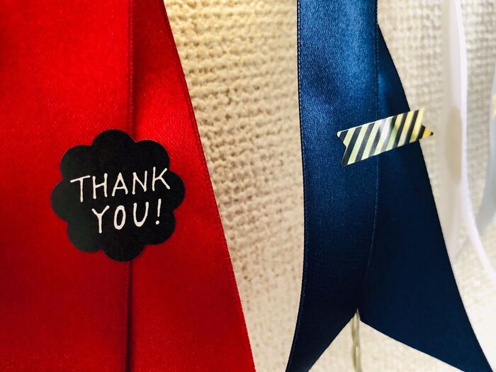 ●ネクタイなタッセルガーランドを制作される場合、沢山のネクタイを吊るしたい場合はその分リボンの長さを要するので、今回材料として活用した10m巻きや3m巻き等、リーズナブルだけど寸法の長さがある商品を選ぶと色合いのローテーションも楽しめて全体のカラーバランスがとりやすいかと♪