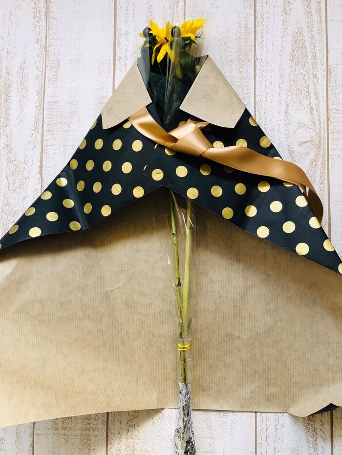 1輪〜3輪ぐらいの茎の長さのある花束を、透明ビニールで包まれたまま先ほどのYシャツの襟元から挿し入れるラッピングスタイルになりますが、花束の幅によって入れずらい場合には、