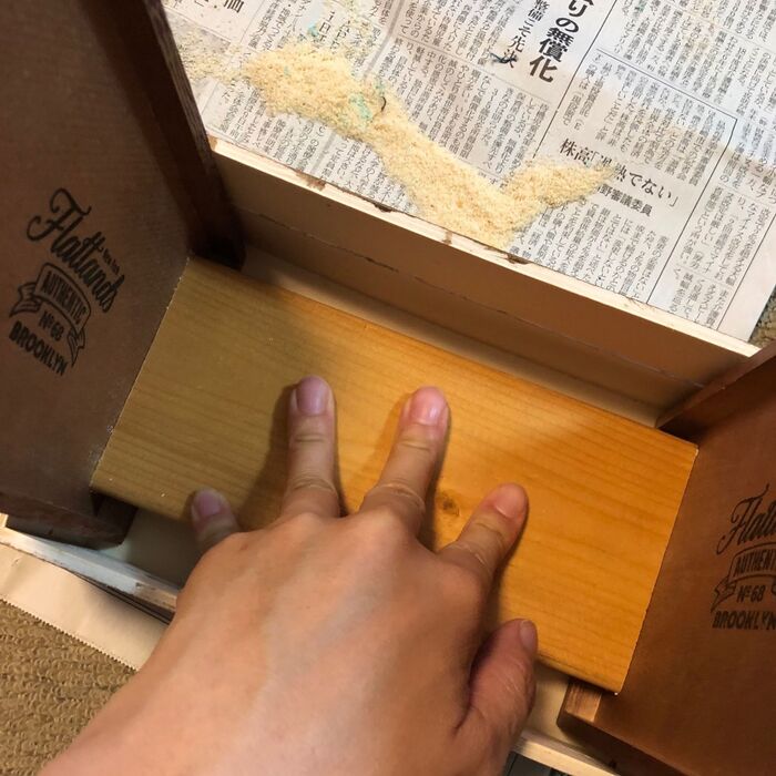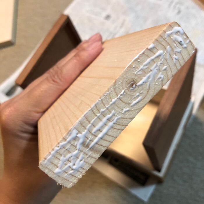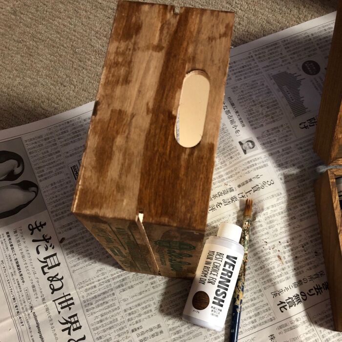 脚になる箱の底部分にボンドを塗って深い箱の内側にしっかり圧着してください。