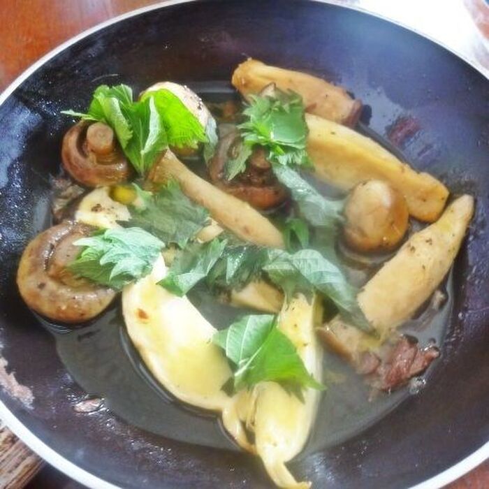 2、フライパンに①、マッシュルーム、☆を加えて煮ていく。