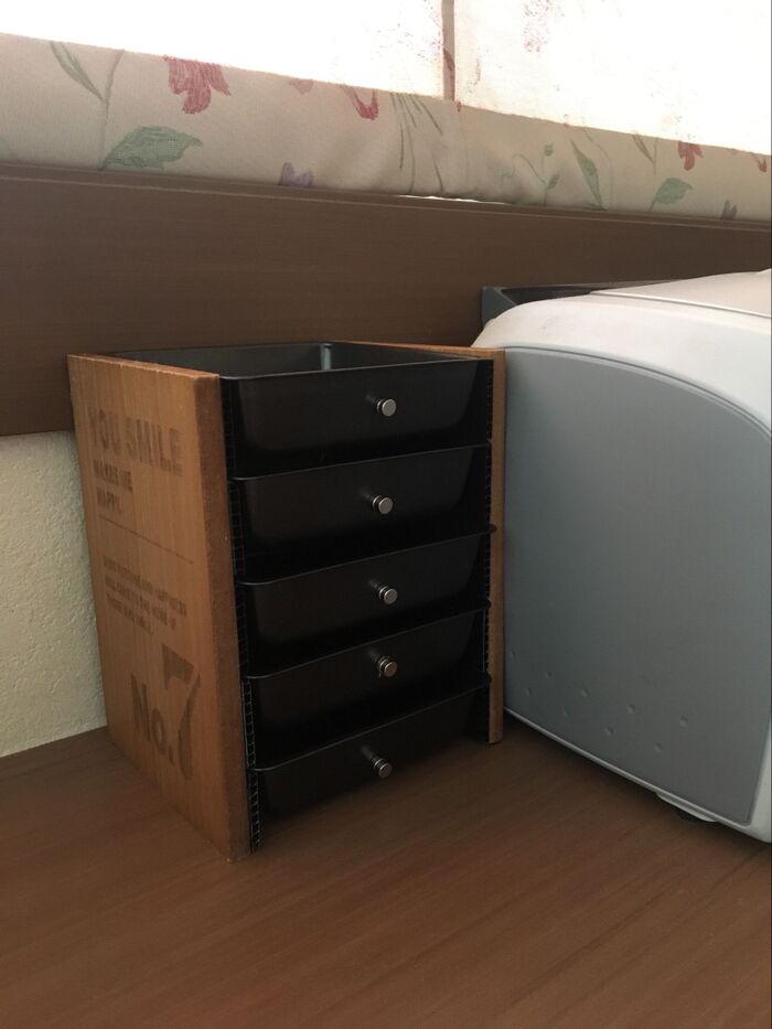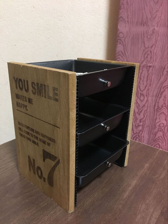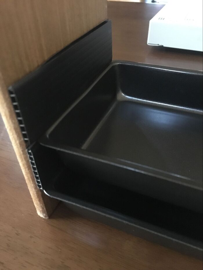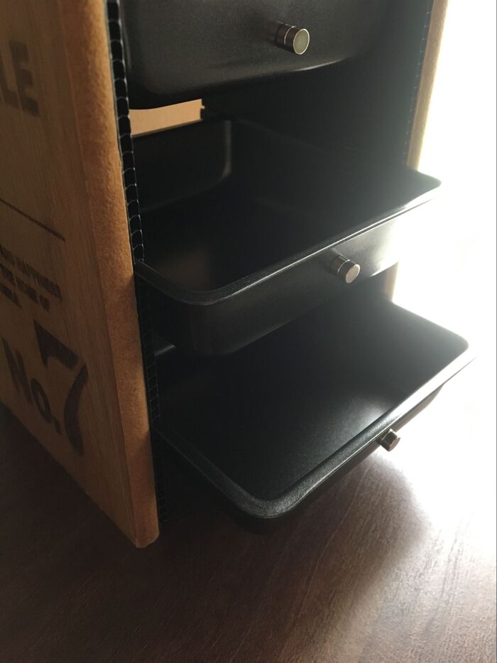引き出しの溝は木製も考えたのですが、黒のプラダンはケーキ型の色と合ってるので違和感もなく、何より作業が楽でした。