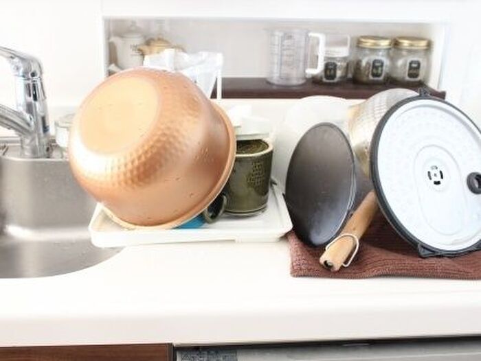 受け皿に乗り切らないときはシンク横の調理台スペースに布巾を敷いて乾かす場所を一時的に作っていました。