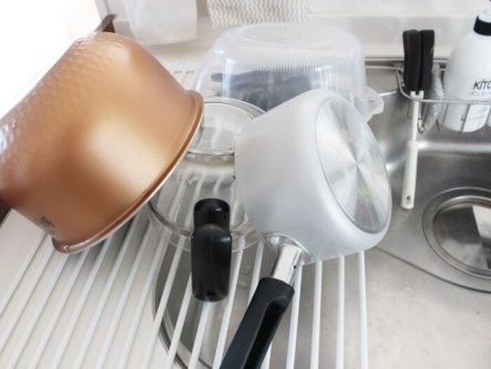 調理台スペースと反対側に置くことで、調理しながら洗い物をして乾かすことも。