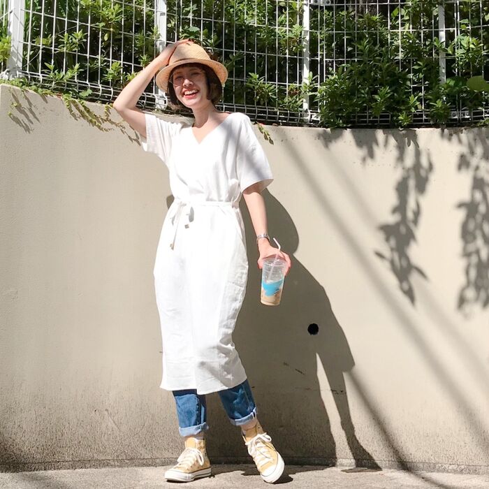 足元は(サンダルは夏本番にとっておきたいので…)敢えてスニーカーを合わせたらトレンドコーデの完成です!