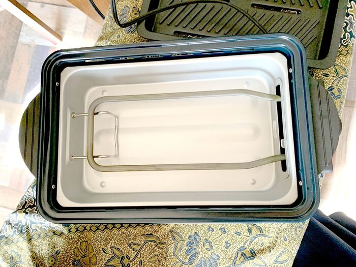 向かって左側の通常プレートのほかに、右側のこの6つの穴が開いていて溝がほどこされているバーベキュープレートが大きな特徴です。