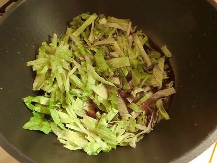 レタスは細切りにします。フライパンに★印の調味料と一緒に入れて火にかけ