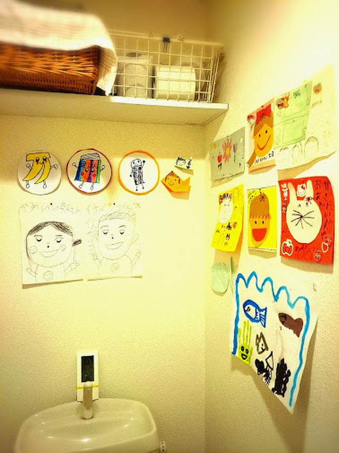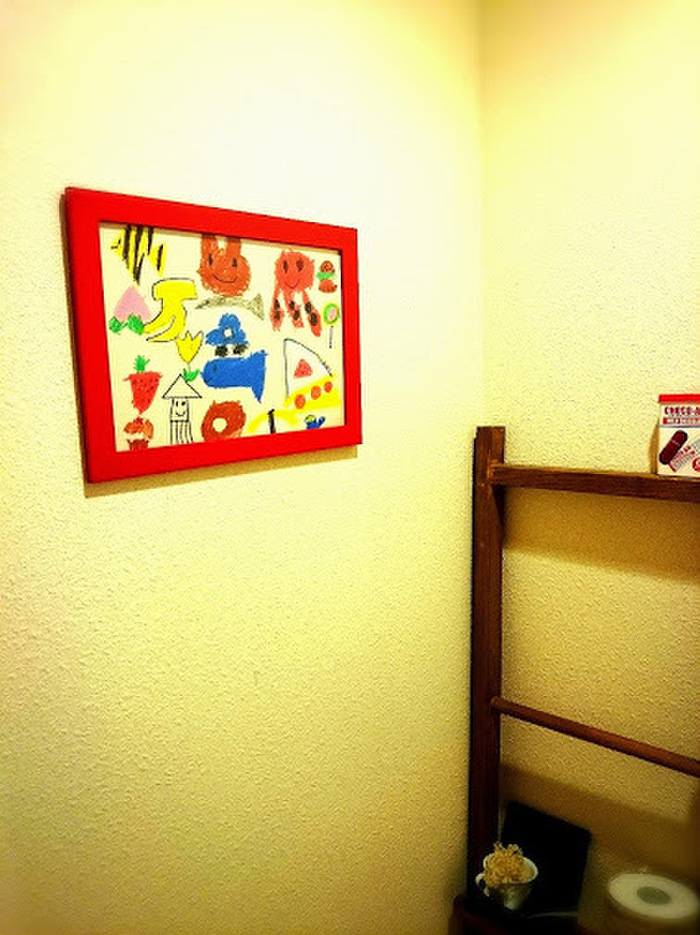 そして、トイレは子供の美術館。小さい頃から、絵を描くと、飾って~!!っとゆうけれど、飾りたいけど、お部屋にぺたぺたはるのは嫌。。。ここなら小さな作品を沢山飾っても、かわいい空間に。。。でも、トイレのドアを開けて最初に見える風景には、ここは見えません。ドアを開けたときは、シンプルがお約束。