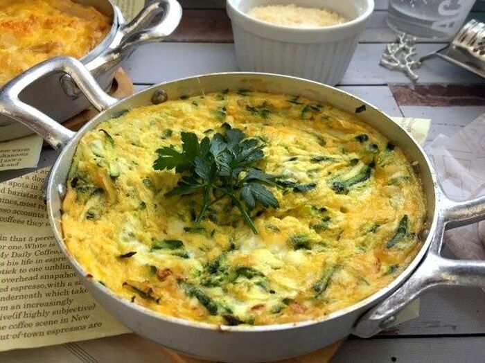 ズッキーニでつくる場合は、スライサーなどで千切りにしてからさっと炒めるか、レンジで2分ぐらい加熱してから卵液に加えます。