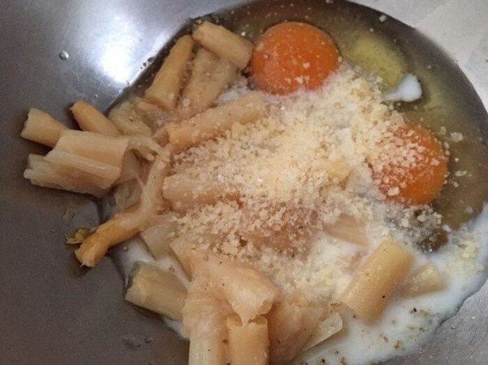 ボウルに 卵 牛乳 グラナ・パダーノ  水気をしっかり切って、ざく切りにしたホワイトアスパラガスを加えよくかき混ぜる