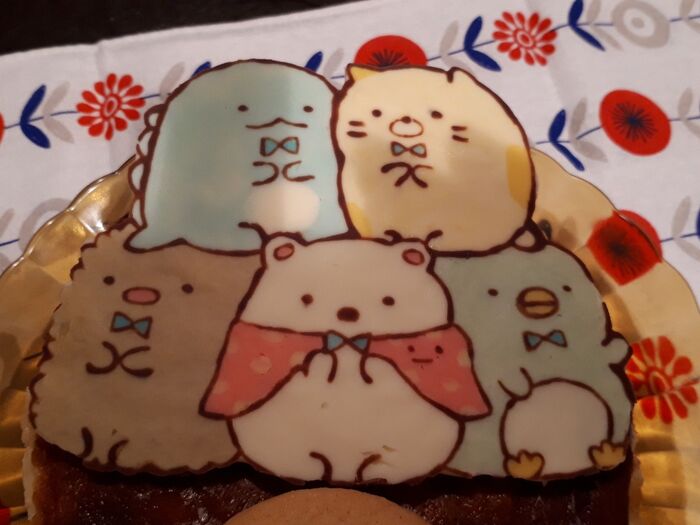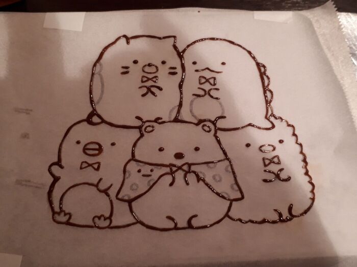 クッキングシートに絵を写して、チョコで輪郭を描きホワイトチョコで色付けしながら重ねていき冷やし固めました。