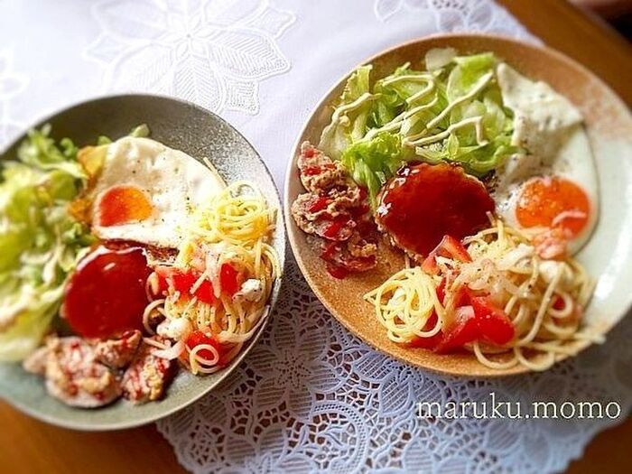 目玉焼きと冷製パスタは実家で作りました。