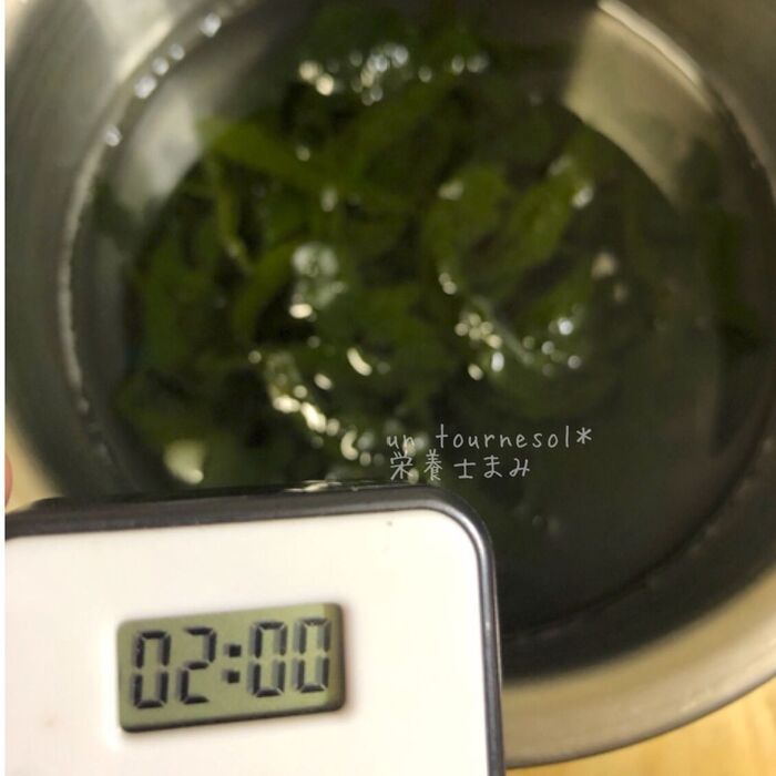 わかめは、たっぷりの水で2分水戻しする。(今回は2分ですが、調節してください)