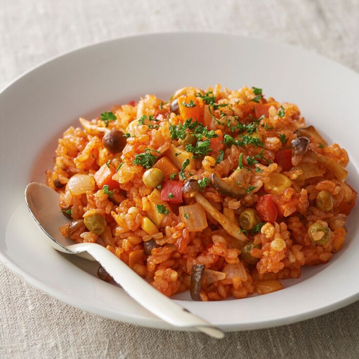 次にミックスベジタブル、しめじ、エリンギ、パプリカ、手順1、手順2、バジル、コショウを適宜加え、ベーシックブレンドと白米が透明になるまでしっかり炒める。