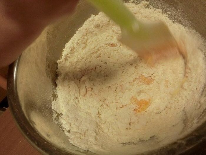 薄力粉、ベーキングパウダーをふるって、ゴムべらで混ぜ合わせます。