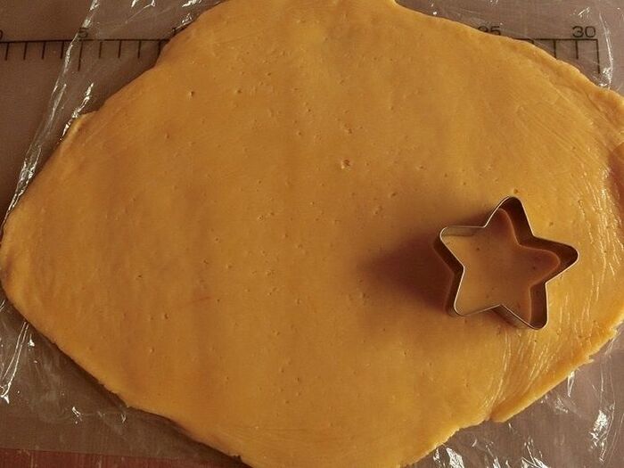 クッキー生地をラップで挟んで麺棒で薄くのばし、型抜きします。
