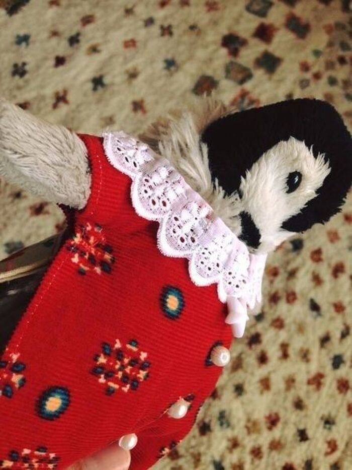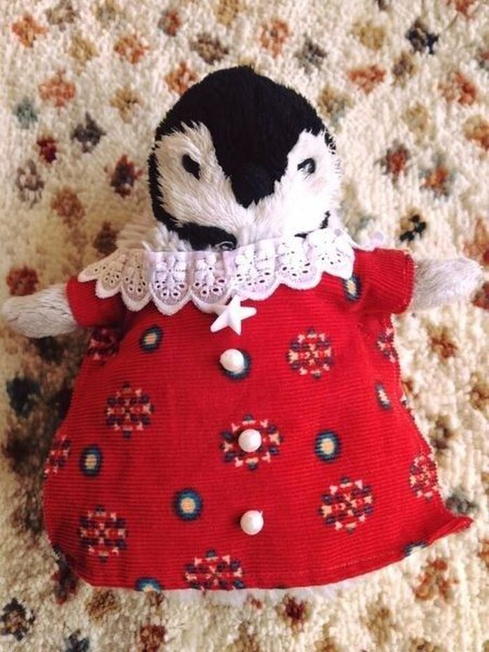 袖口をとった後の余った袖の部分で、ペンギン用の被りワンピースを作りました。