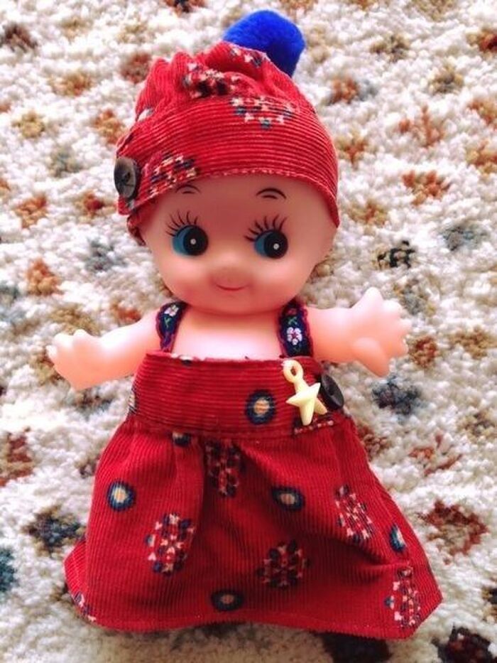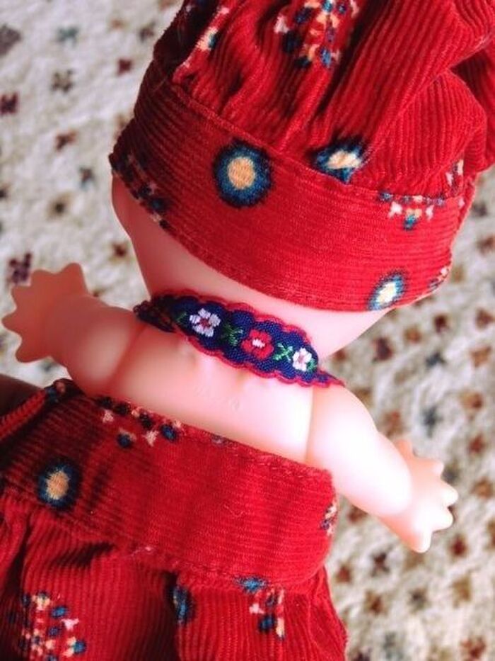 もう片方の袖口の部分がキューピーの頭にぴったりはまった♪ので、帽子に。