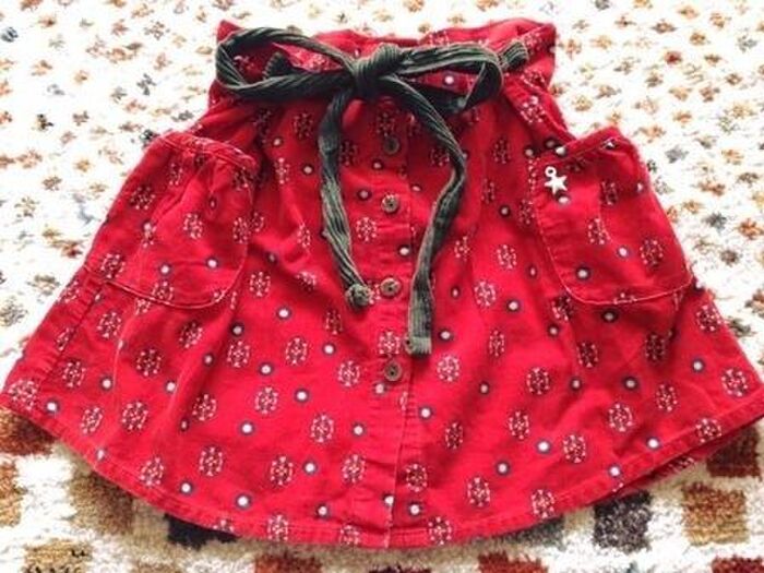 後は、横2か所にコーデュロイ地の紐を縫い付け、腰でギュッと結んで着られる様にしました。