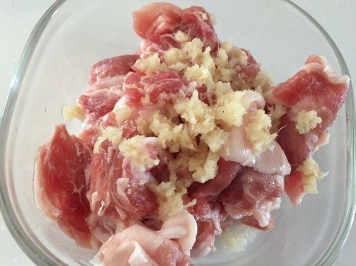 豚バラ肉は5~6cmの長さに切り すりおろしたしょうがと酒をふりもみ込んでから