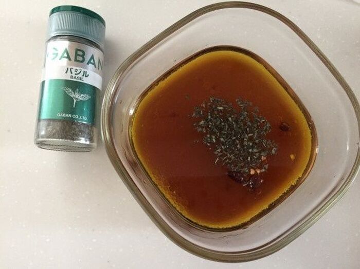 フレッシュなバジリコと、マリネ液に加える乾燥のバジルのダブル使いをしています。