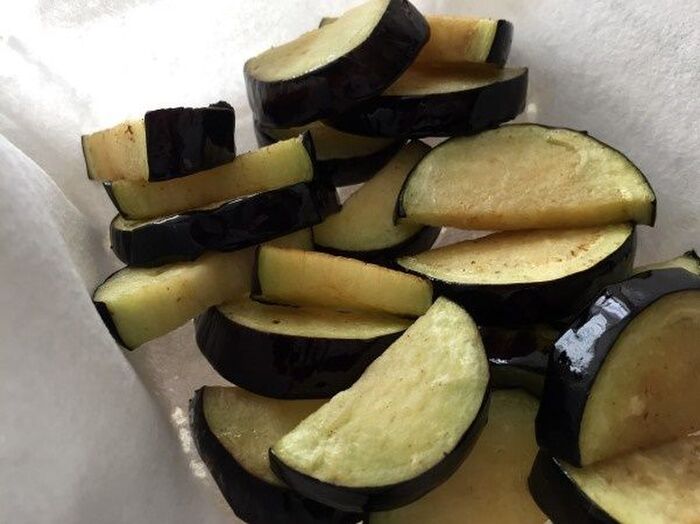 ナスは縦半分に切り くし切りにして 豚バラ肉を揚げたオイルで 素揚げする