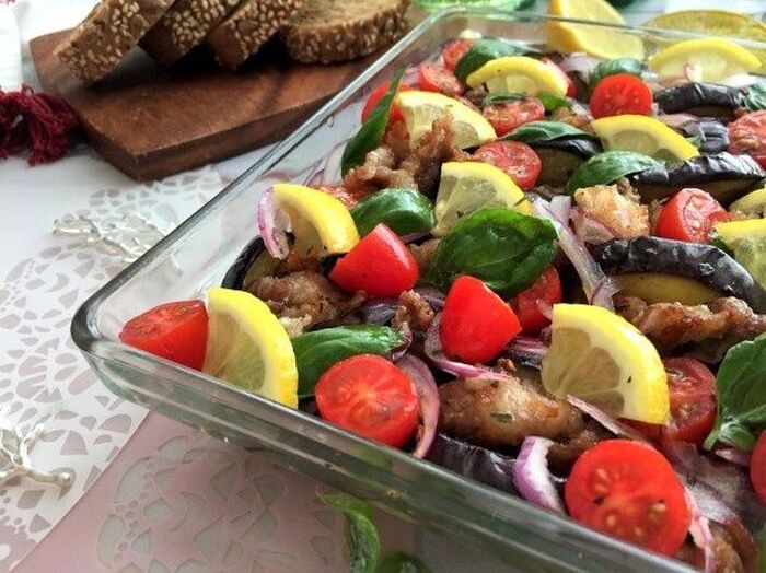 器に 豚バラ肉 なす 半分に切ったプチトマト 薄切りの紫玉ねぎ