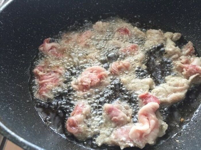 フライパンに揚げオイルを入れ 豚バラ肉をカリッとするまで揚げる