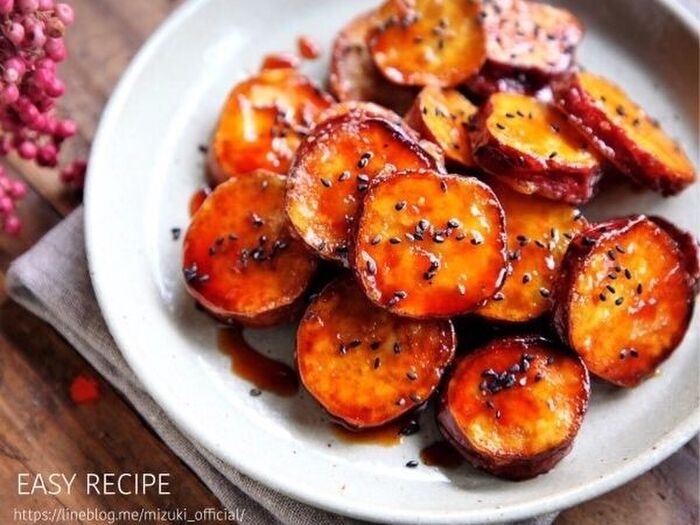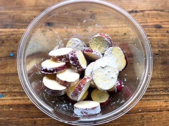 1.さつまいもは皮付きのまま1cm幅の輪切り(大きいものは半月切り)にする。3分水に晒して水気を切り、片栗粉をまぶす。
