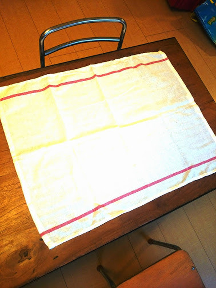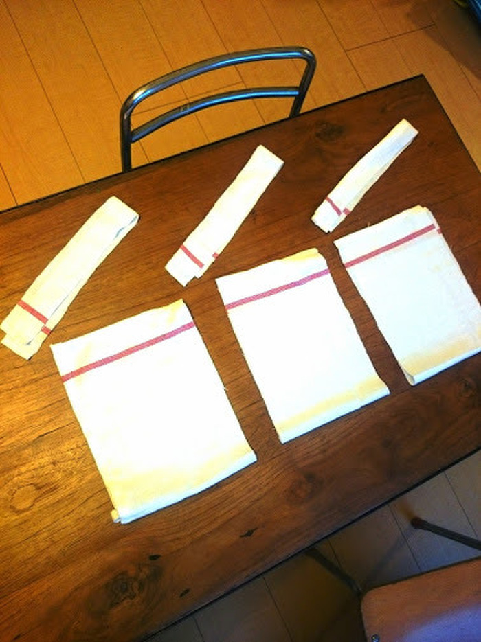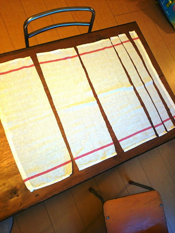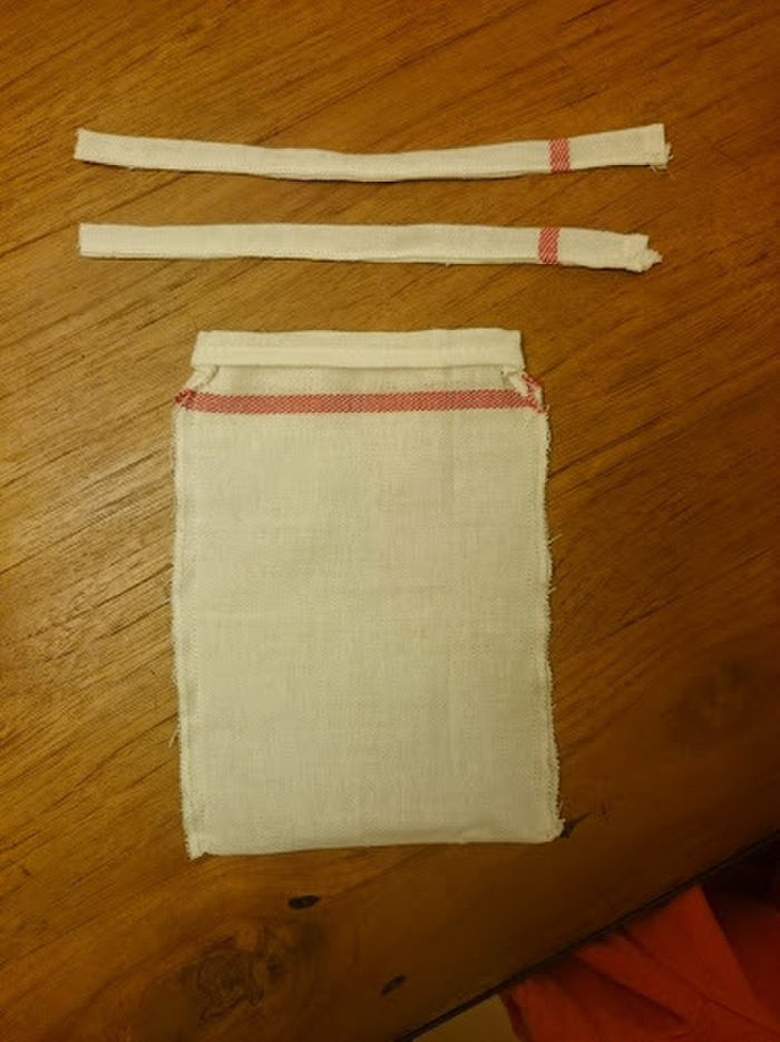 袋の部分は中表にして半分に折って、袋状に。。。もち手の部分も、ミシンで縫い、半分の長さに切ります。