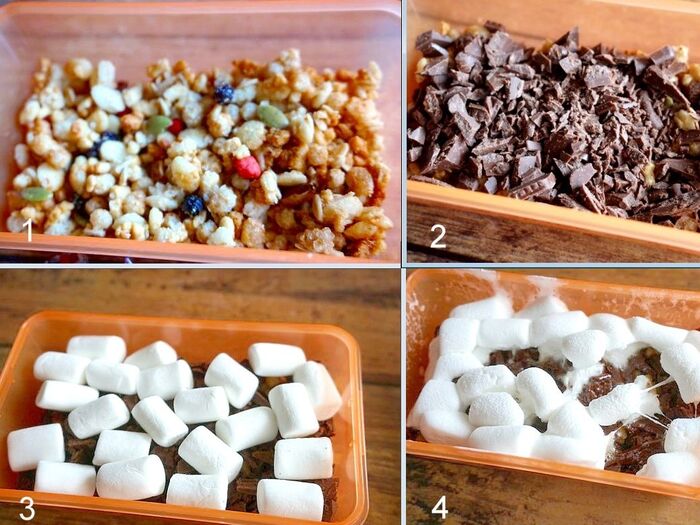 次に刻んだチョコを乗せ、1番上にマシュマロを乗せ、