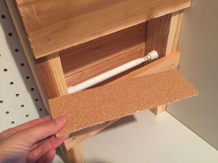 突っ張り棒を渡し、カットしたコルクボードをはめ込むだけで、簡単に棚板が完成します。