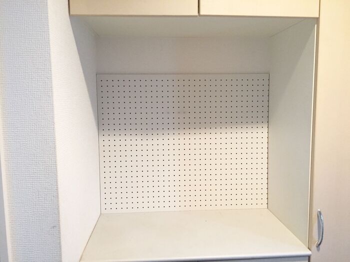 今までの収納を一旦綺麗に撤去し、有孔ボードのみ残した状態にしました。