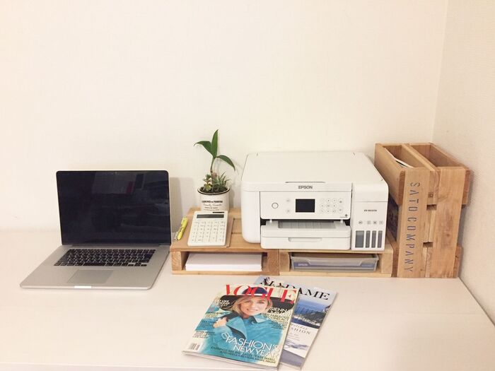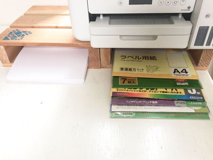 30×30センチのパレットは、A4用紙がぴったり収まるサイズなので、プリンター関連の収納としてぴったりです。カラフルな袋に入ったプリンター用紙もプリンター下にスッキリ収納。どこに行ったのか探す必要もなくなり便利!パレットの元々の用途は、荷物を載せて運ぶためのもの。強度にも優れているので、プリンターを上においても問題ありません。