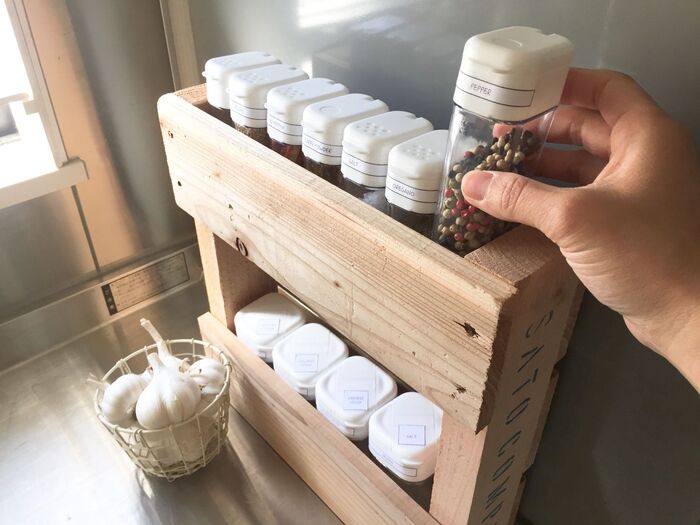 突っ張り棒を通すだけで簡単にスパイスラックの完成です。