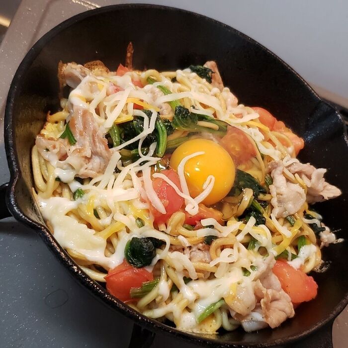 真ん中に生卵を、全体にシュレッドチーズを散らしたら完成。すき焼きみたいに真ん中の生卵をつけながら食べます。