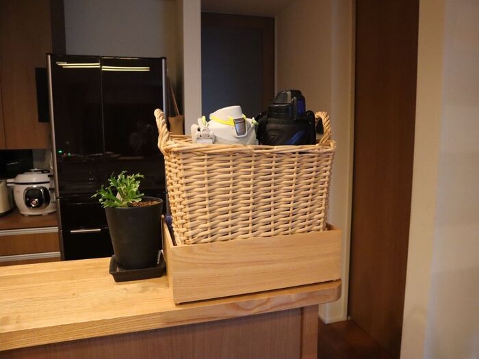 ・カゴでまわりのインテリアとなじませて、スッキリ感をだしている。