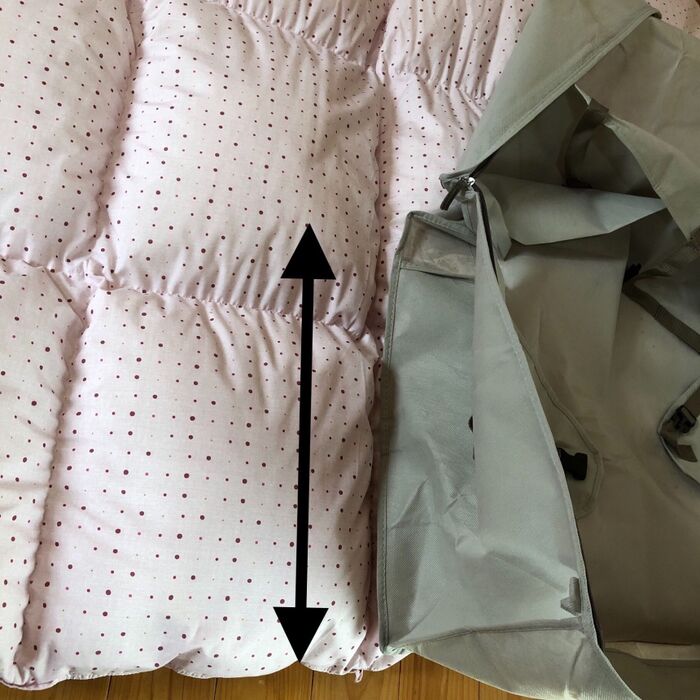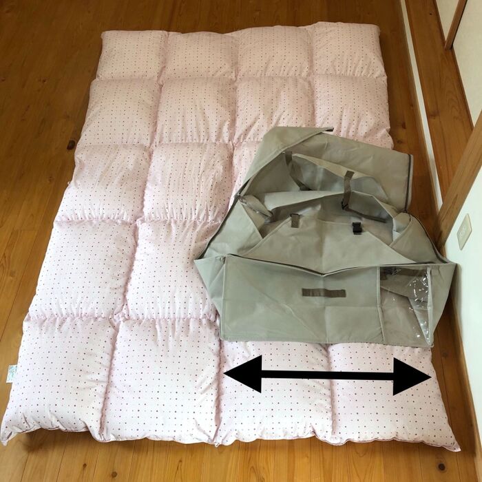 布団のサイズとカバーのサイズを比べて…横幅は半分でいけそうです。
