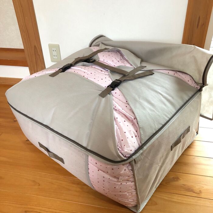 バックルがはまるまで、少しずつ布団を押します。