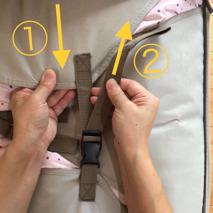 バックルの締め方はこうです。①の全体を持ち、引き寄せながら②のヒモを締めます。簡単にできますよ☆